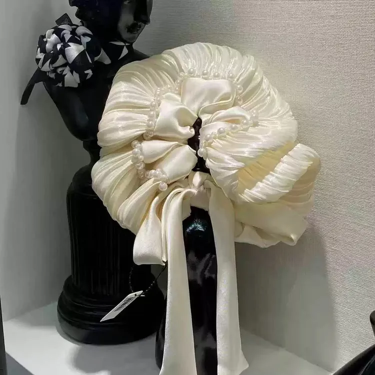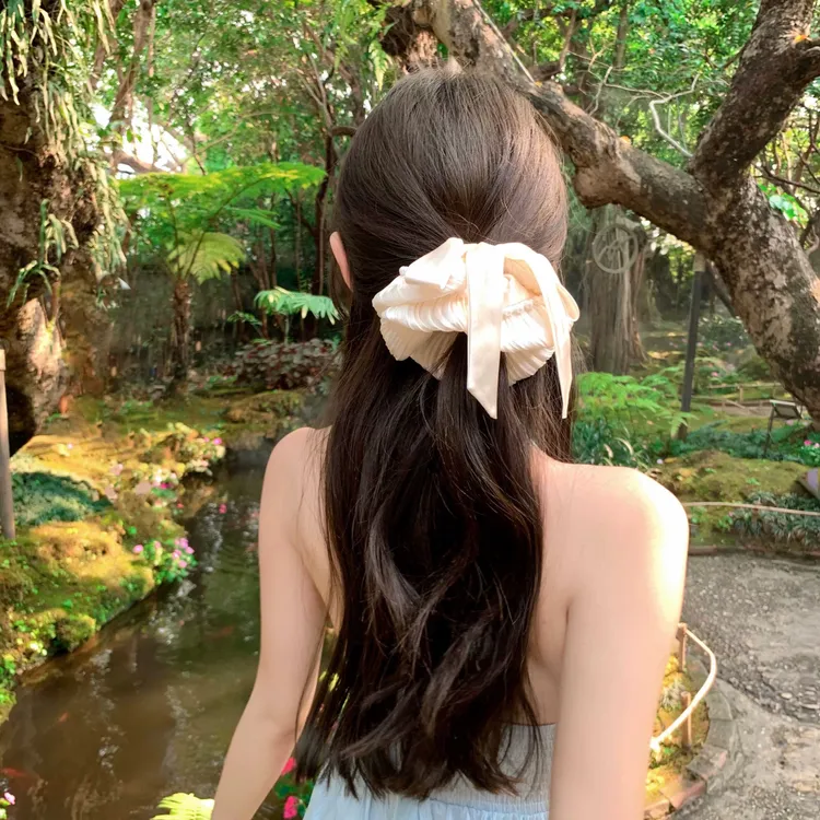 韓版甜美高級感皺摺緞面珍珠蝴蝶結飄帶大腸髮圈 #低馬尾 #丸子頭 #赫本風
